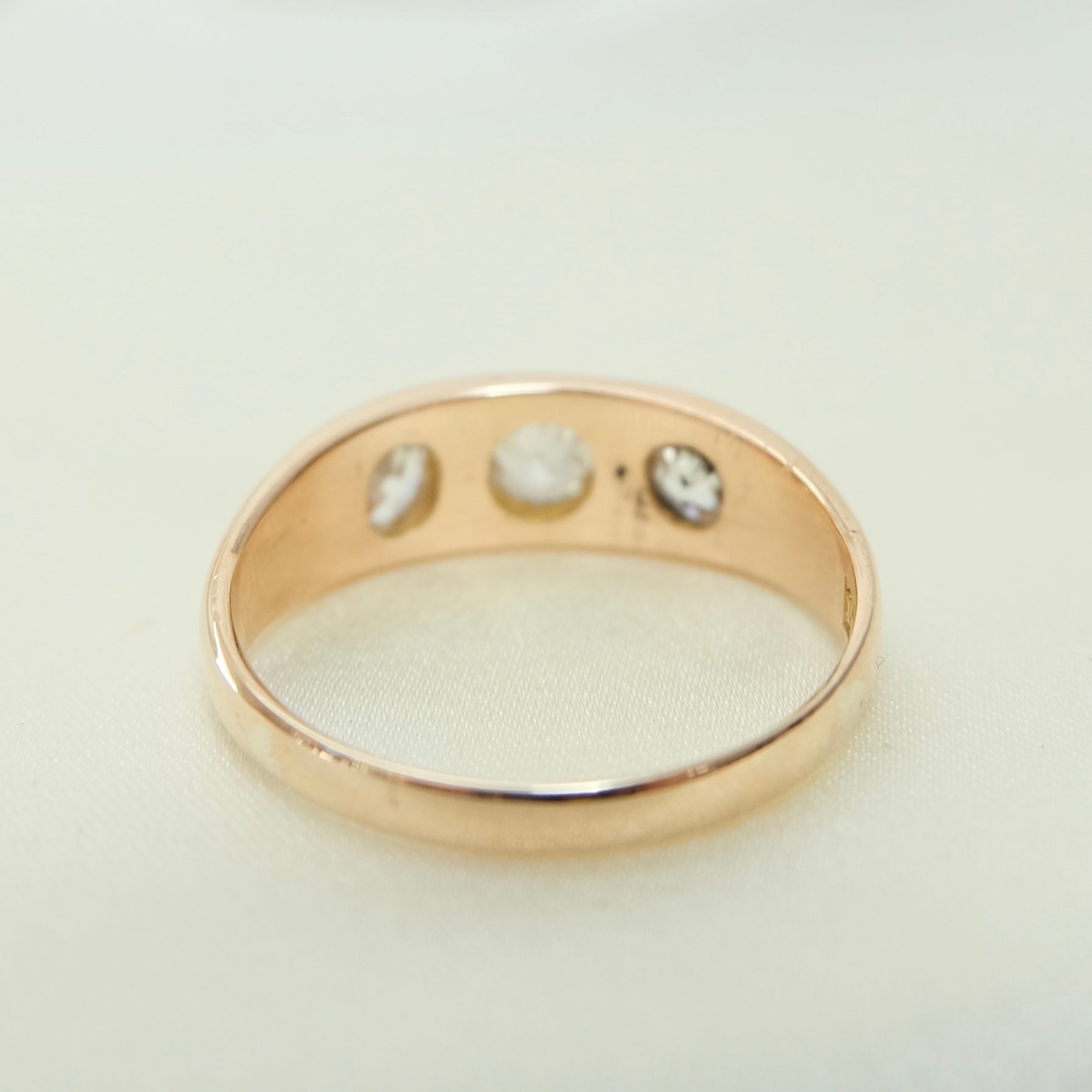 Welcome to the 1900s where diamond shapes are imagined by the glow of candlelight and rings are destined for romance. This 1890 stunning 15k Victorian trilogy ring is truly special. Set with 3 x Old Mine Cushion cut diamonds at a half carat each (totaling approximately 1.5 carats) and nested in a rare 15k gold with a gentle rose hue.