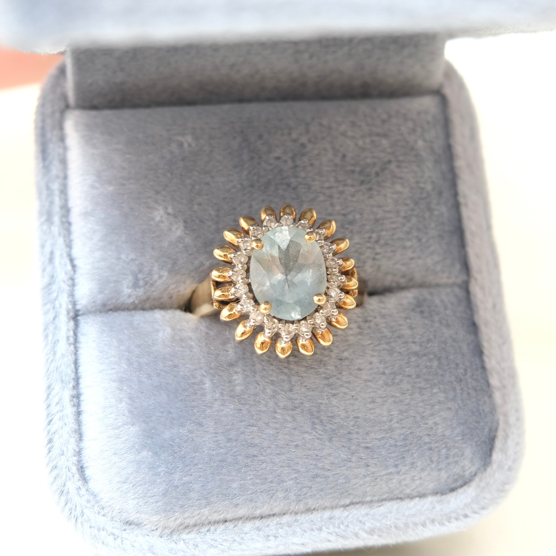 You cannot miss this standout beauty from the 60s, featuring a one carat trillion cut icy blue aquamarine stone with stunning detail - absolute jaw dropper. Set in 10k gold it's a size 6.75