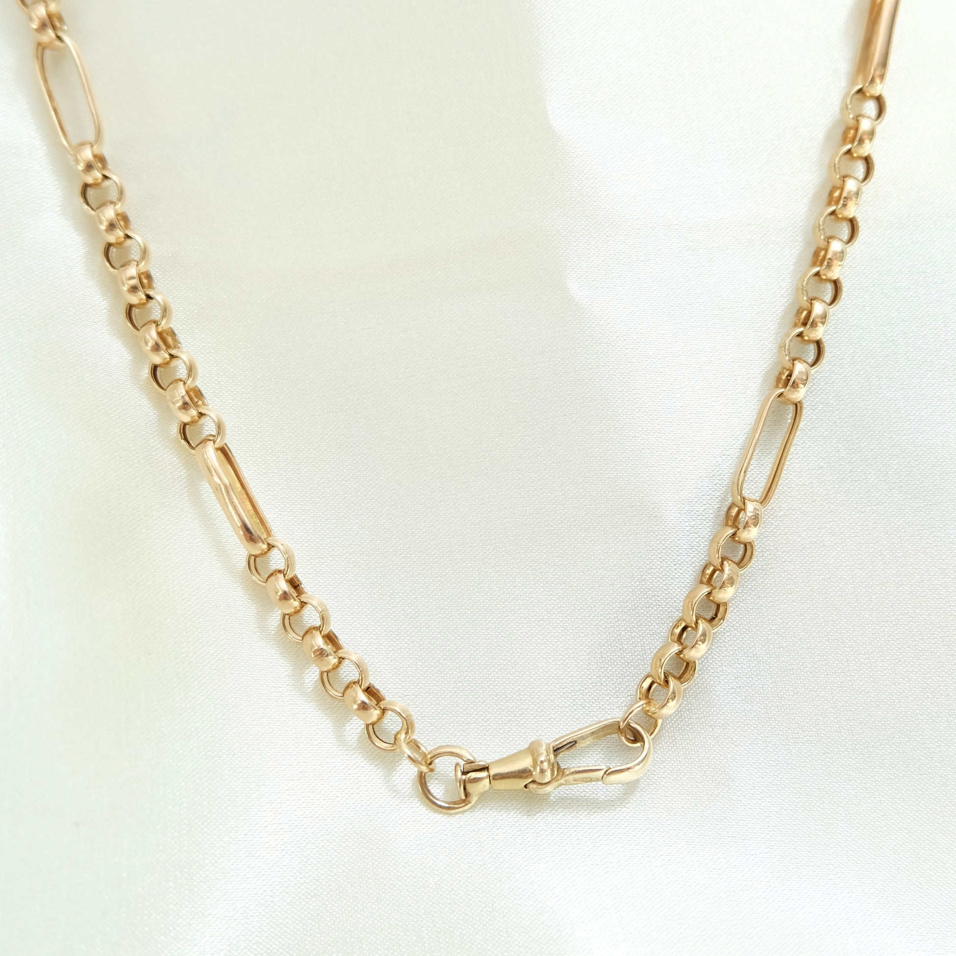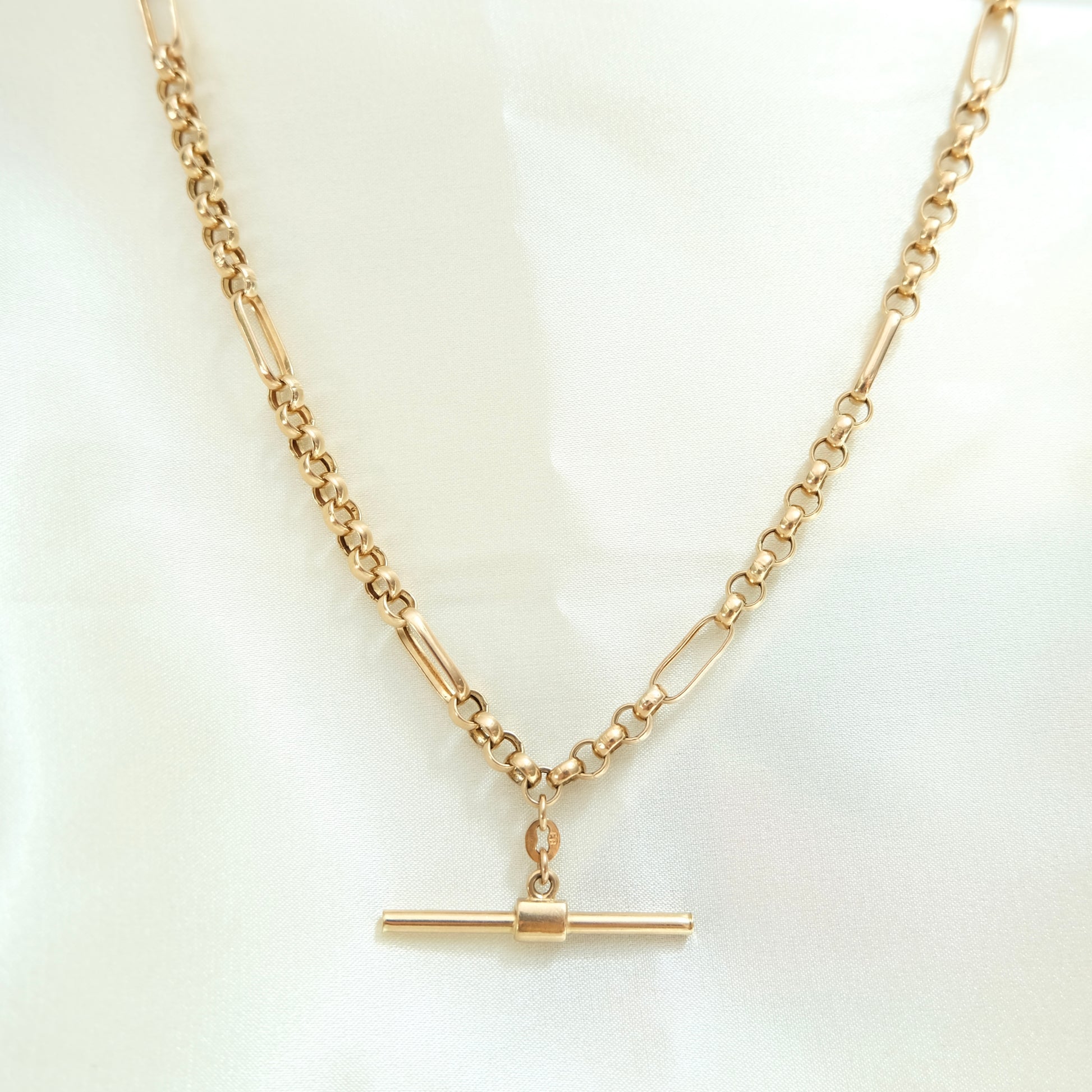 ✨ Fall in love with this absolutely classic antique necklace chain ✨ A 1900s treasure, this classic 9K solid yellow gold (with mellow rose gold hues) Albert chain with T Bar and dog clip clasp sits at 18 inches long and weighs 13 grams. These necklaces are certainly a rare breed when it comes to vintage and antique jewelry. A stunning statement piece, works perfectly on its own or paired with one of our vintage fine gold chains.