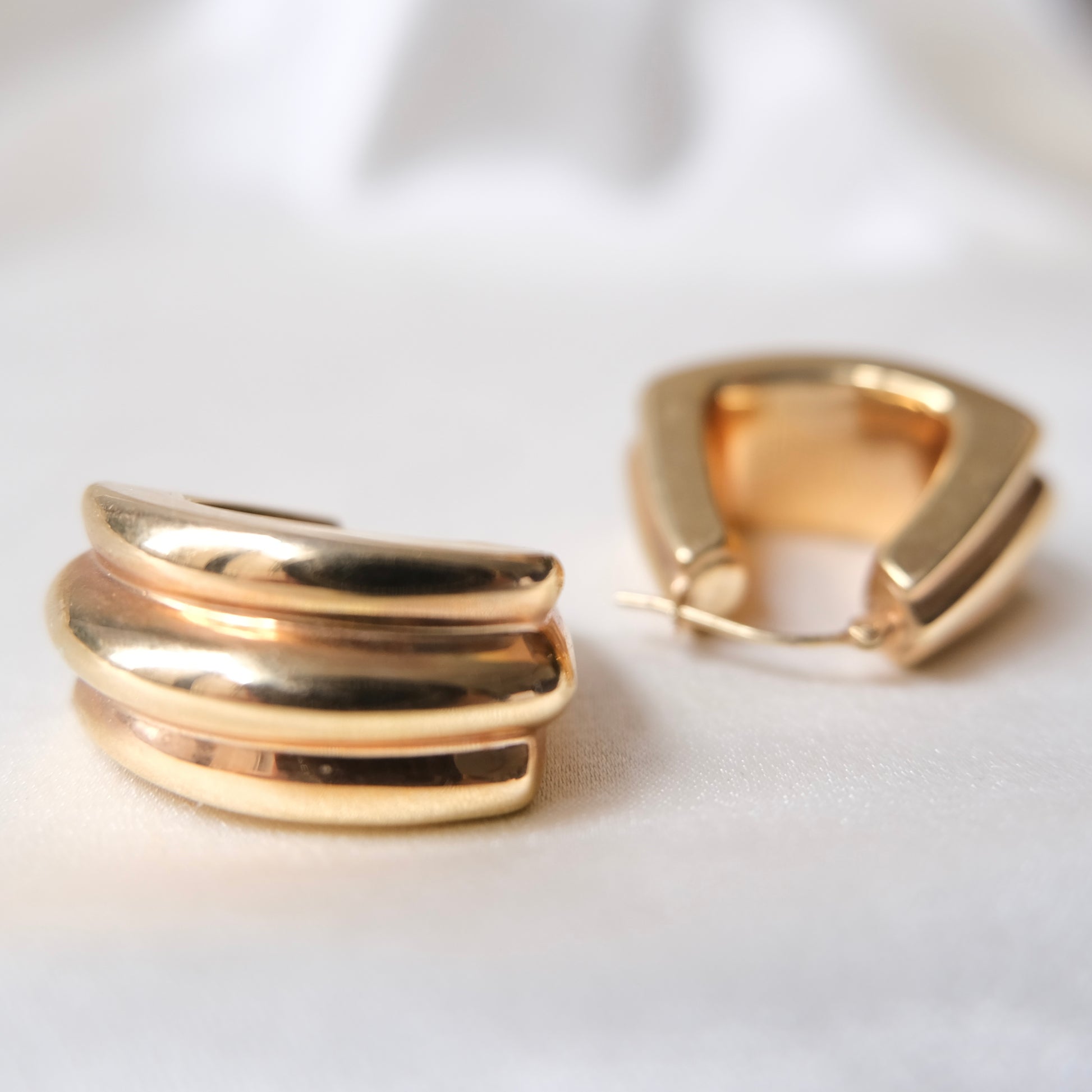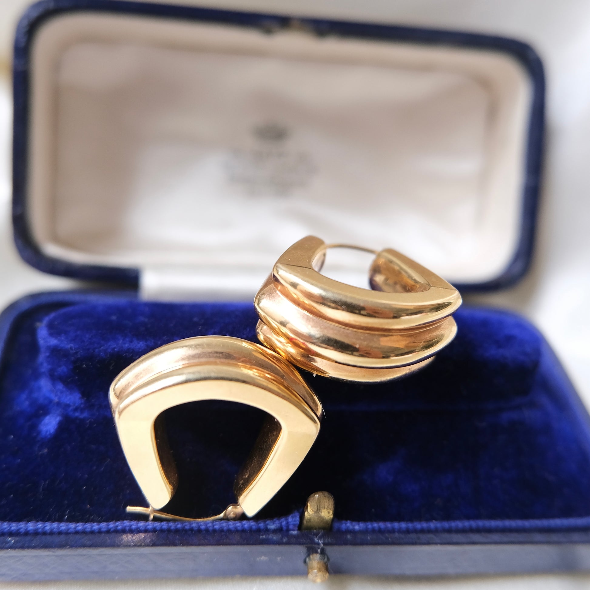 Sail away to St Tropez with us where the sun is golden and the waters are crystal blue. These stunning vintage solid 14k gold wide art deco style statement hoops from the 70s know how to make an entrance. The curved ridge detail makes these something out of 70s vogue and we are totally in love. Great condition with snap close posts and a beautiful buttery gold color that looks almost 18k. Pairs perfectly with your silks, linens, and a hefty dose of stacked gold for the Summer. Wear all day, every day - they’re a pair to cherish forever 💫