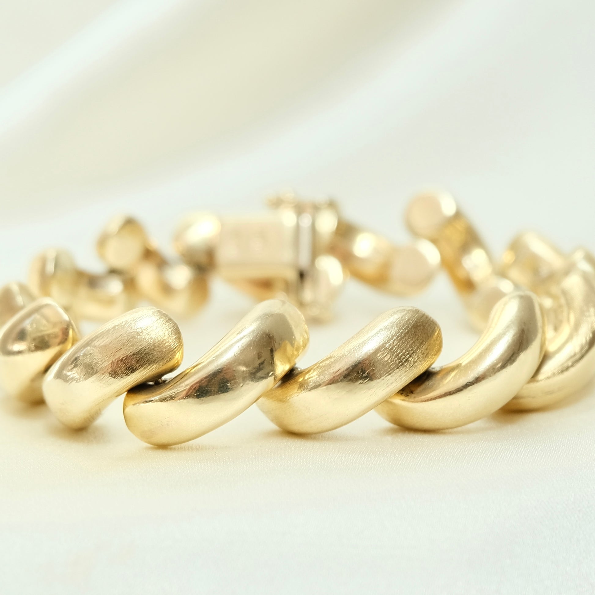 The epitome of Italian glamour. Hailing from the 80s is this generous sized San Marco bracelet in beautiful 14k Italian Gold. A stunning buttery vintage gold with full Italian hallmarks and the most standout statement vintage push clasp with a figure 8 fastener - this bracelet is so luxe even words cannot do it justice. With a beautiful weight to it at 26.5 grams, wear it on its own or stack it with your everyday pieces - it’s the most magnifique bygone era bracelet at 6.75 inches long.