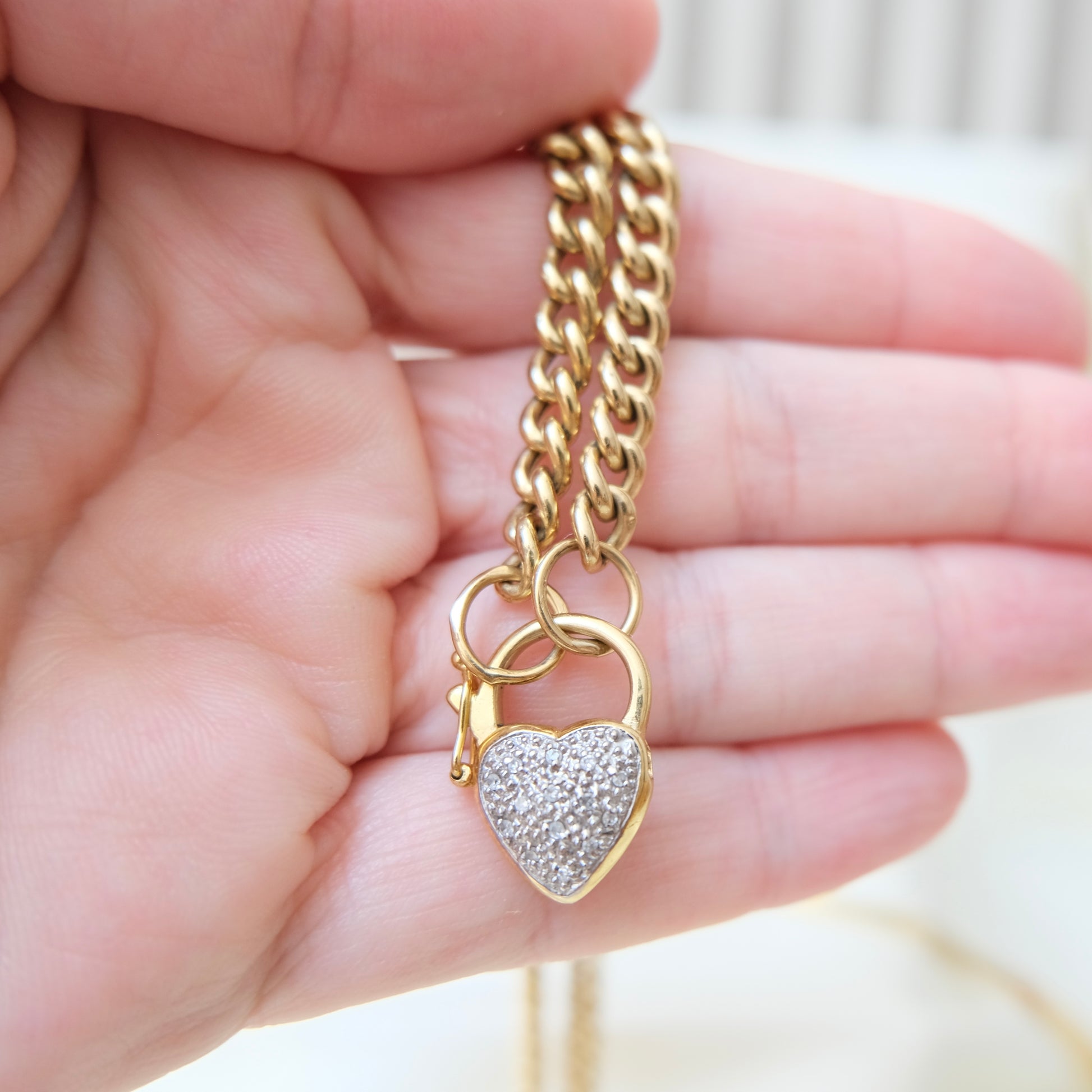✨ Fall in love with this statement piece in a great layering length and weight from the 1990s ✨ A heart lock featuring 6 small diamonds and white gold accents joins the curb link together. A fun statement piece that makes for a great daily wear.