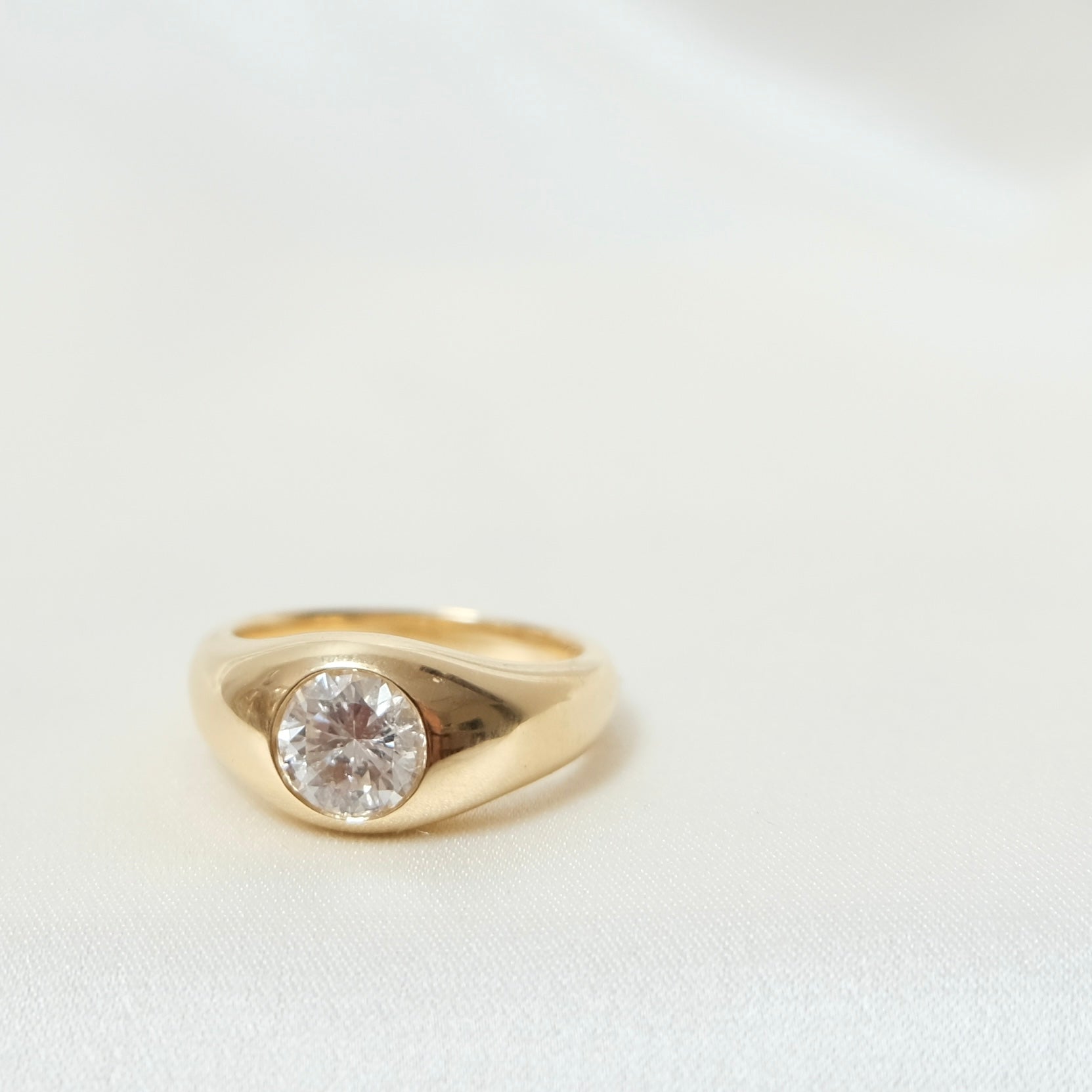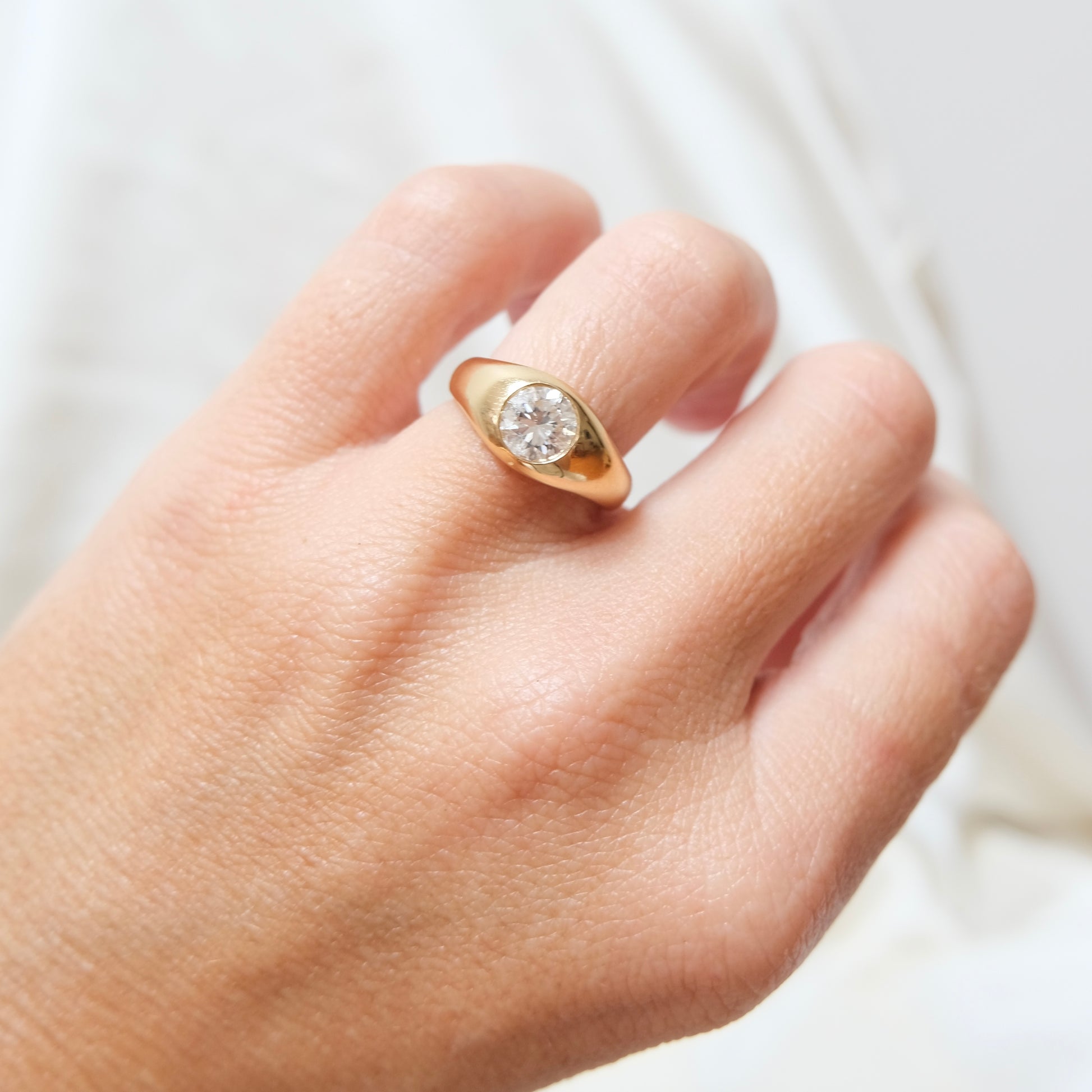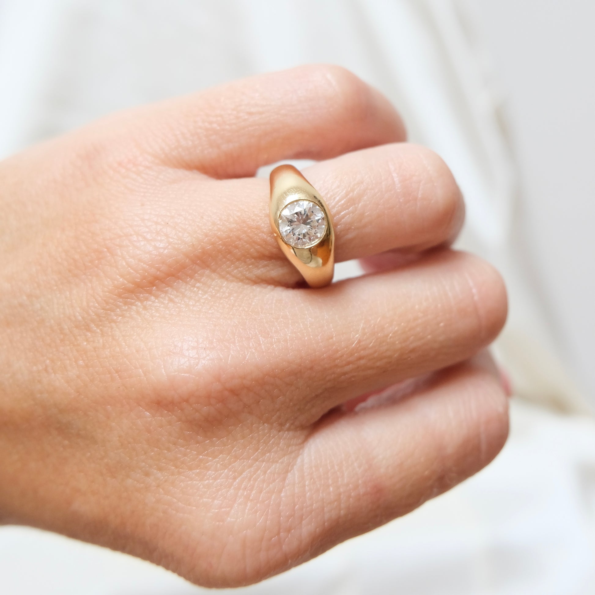 A piece of history ready to start a whole new story with you. A (1ct +) large natural brilliant cut diamond from an era now past beams through a luxurious setting made of 18k French recycled gold.