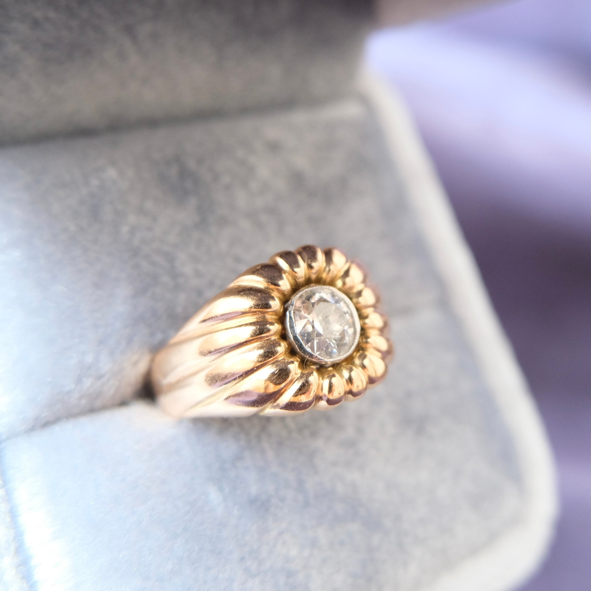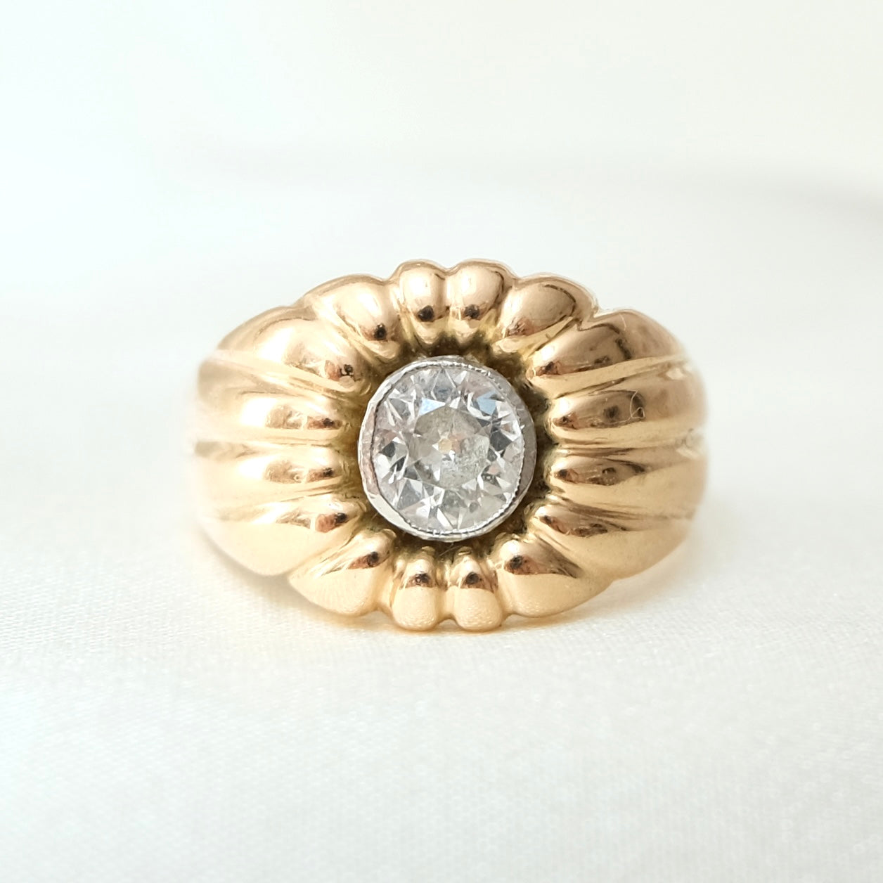 One of the most beautiful, unique rings we’ve ever found. A serious heirloom Reminscent of a sunflower, the gardooned craftsmanship is so detailed and unique - it is like nothing we've ever seen before. At it's center you'll find a lovely old mine cushion cut bezel set in platinum. An outstanding ring for an engagement or simply a statement piece. Circa 1970s