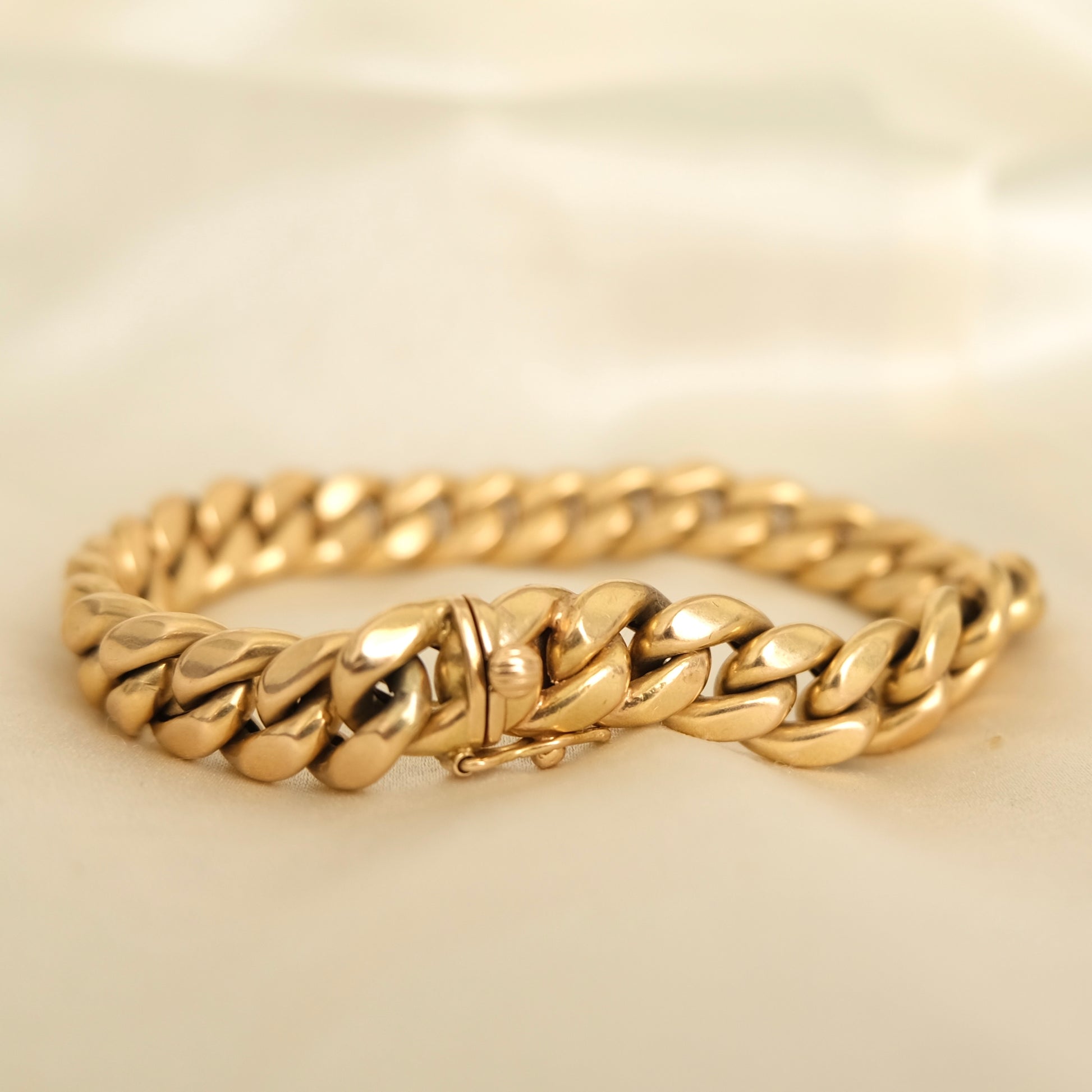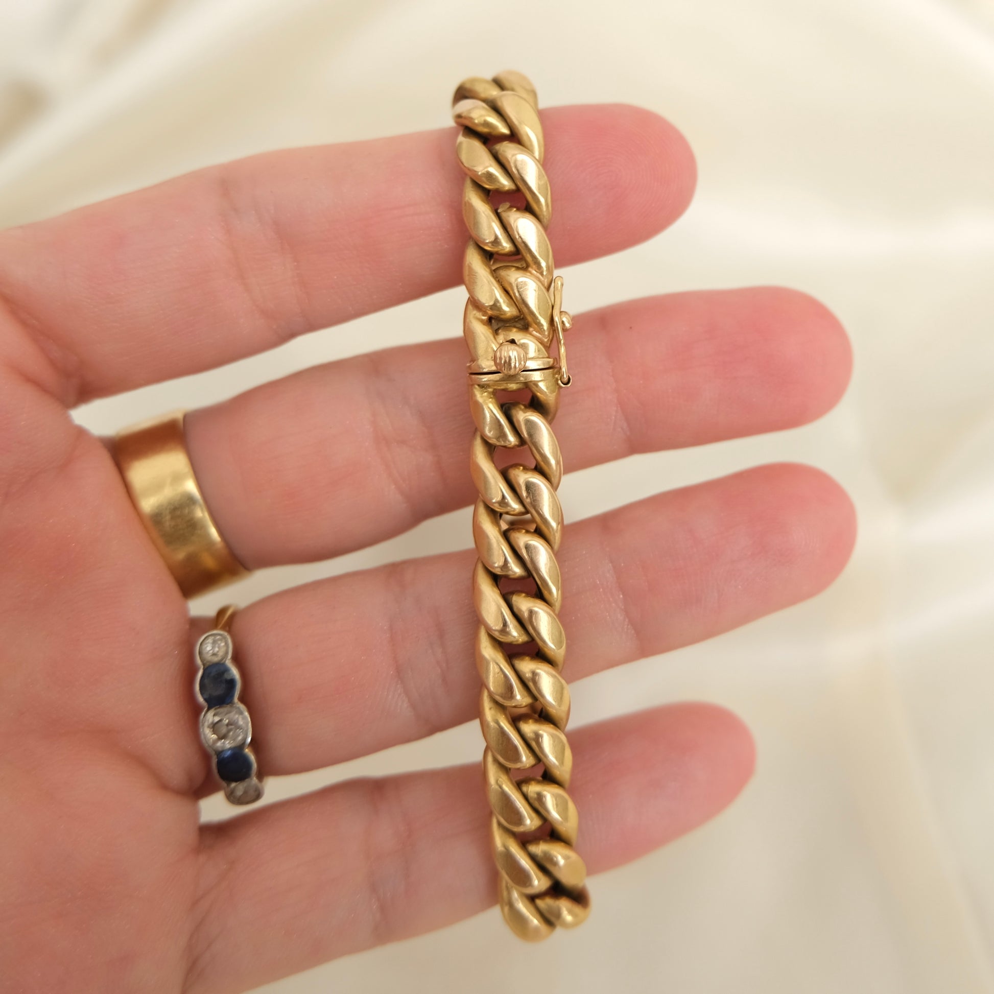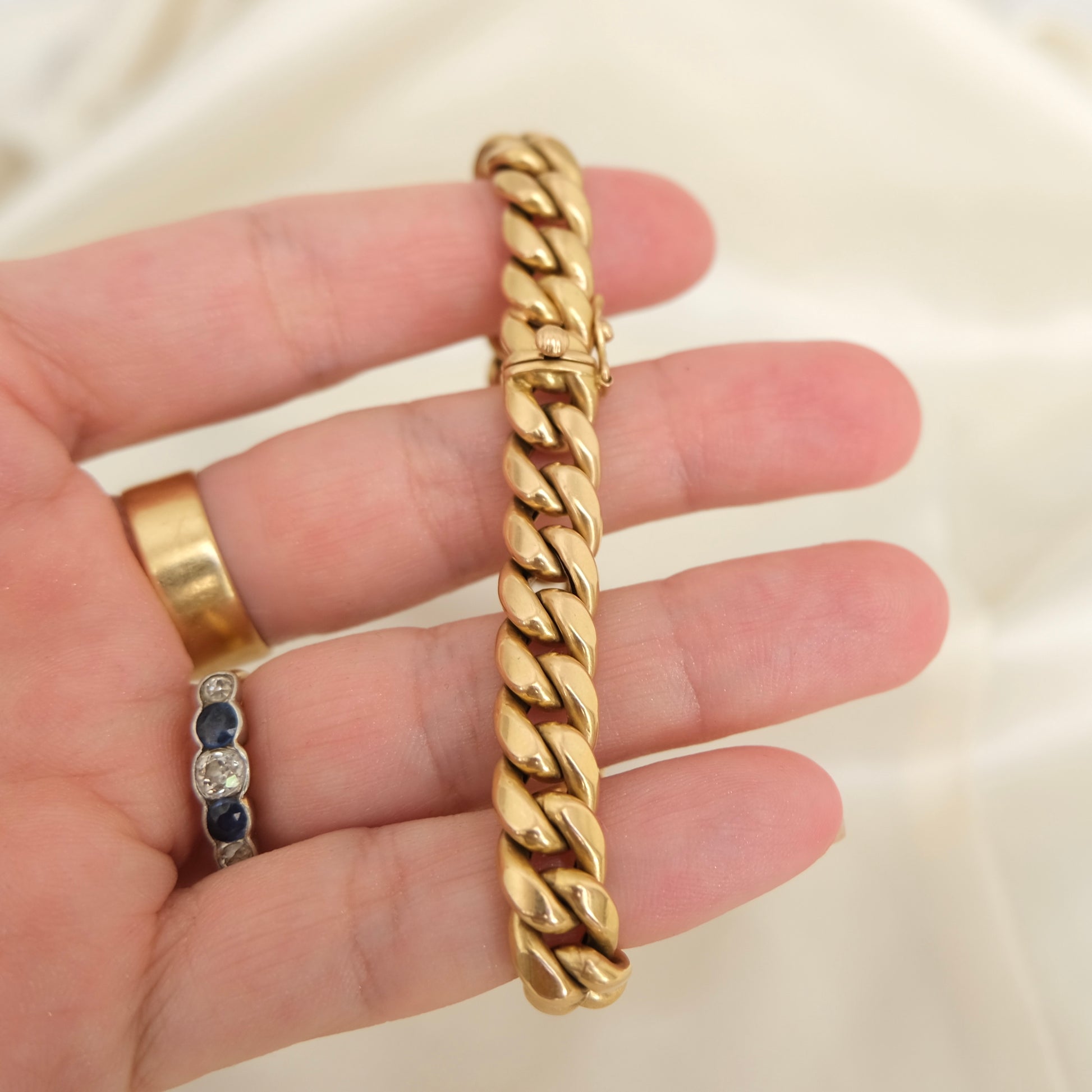 Made in Milan in 1901 this beautiful buttery old gold curb link bracelet with box clasp was the second-ever design from this antique Italian jeweler. 24 grams and 7.5 inches this 18k standout will be an heirloom to treasure forever. Made in Italy. Rare.