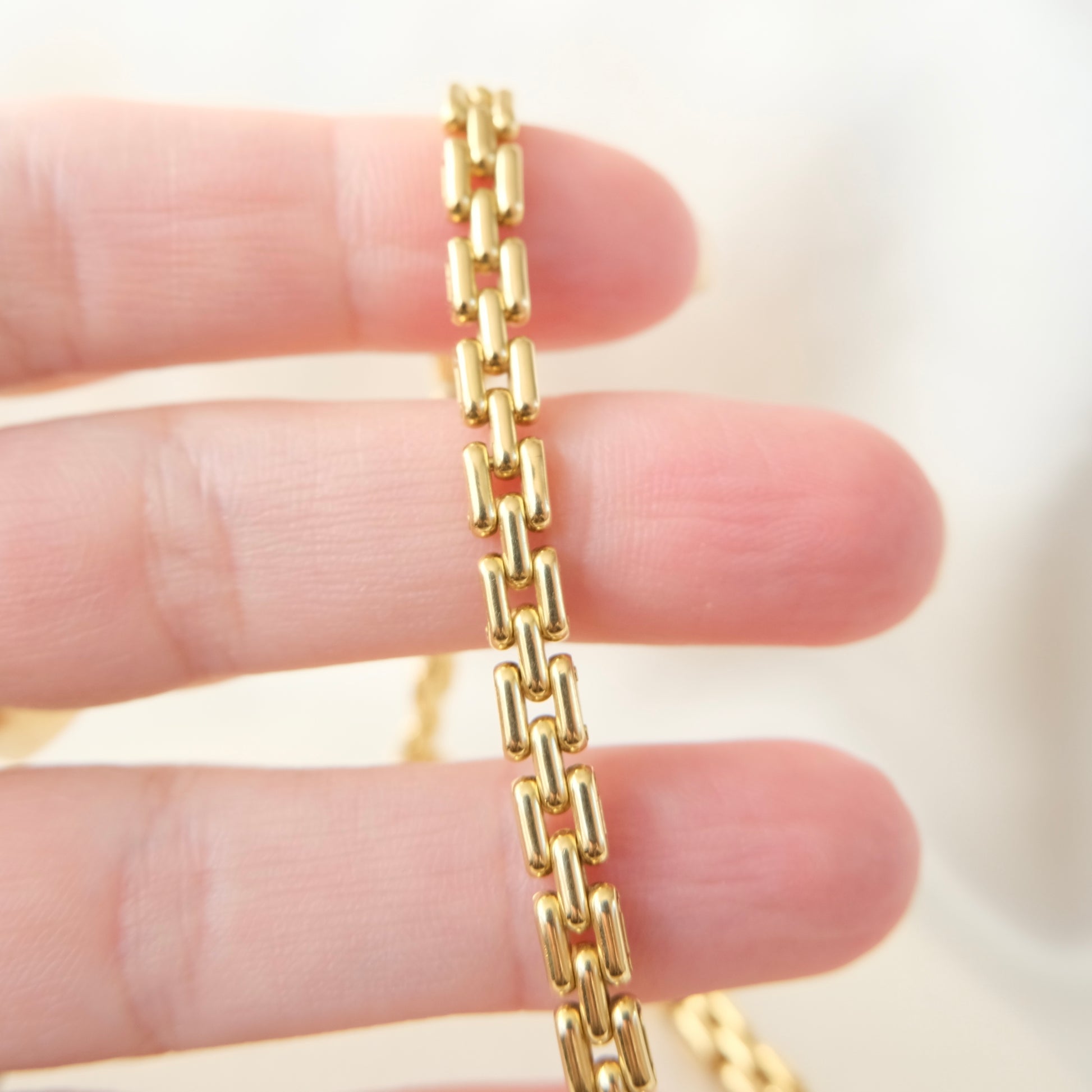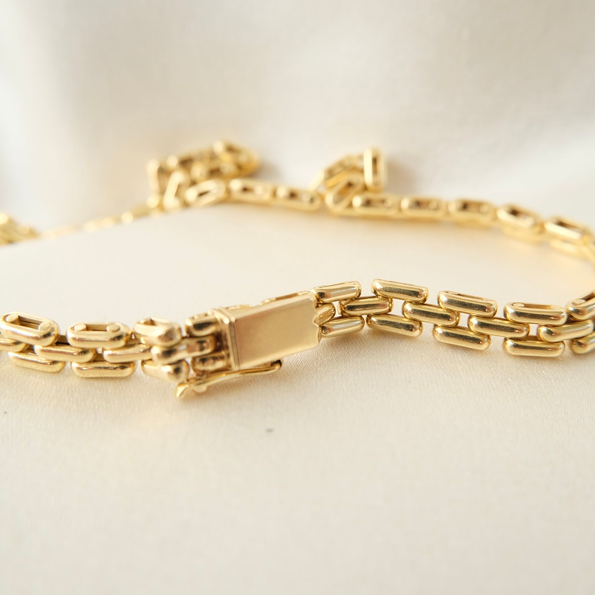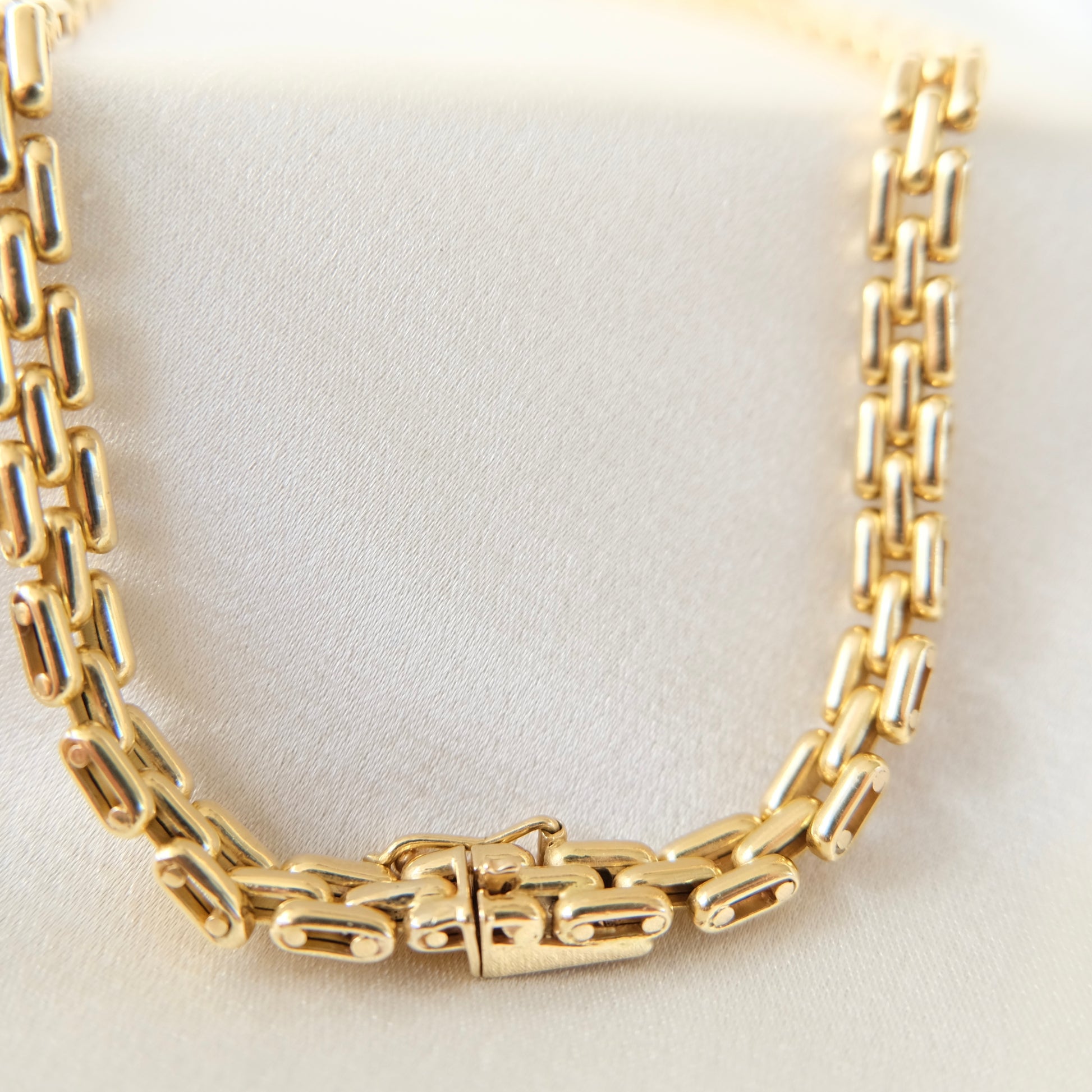 A stunning 18k gold, French panther link necklace in perfect condition with box clasp (the best kind of clasp). Measures 16.5 inches, 25.2g circa 1970.