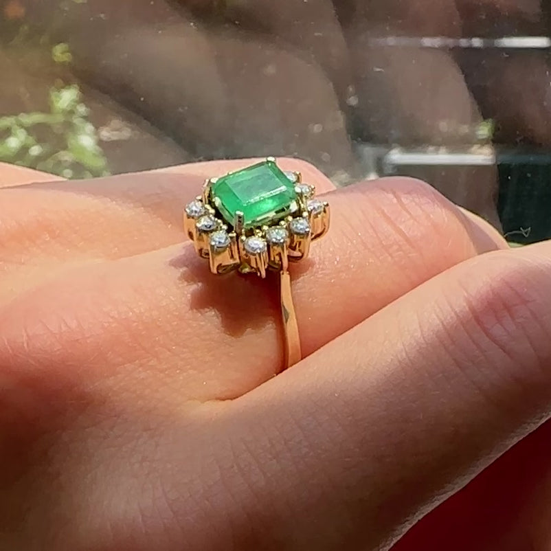 Dive into this perfect green emerald pool with us and bask in its history. A 2 carat blue green emerald boasts from the center of over half a carat of eye-clean diamonds. From the 1980s and found in Sicily, Italy, this beauty is in perfect condition - the emerald features some marble-like inclusions which add to its extraordinary look. A size 7.5 but can be sized.