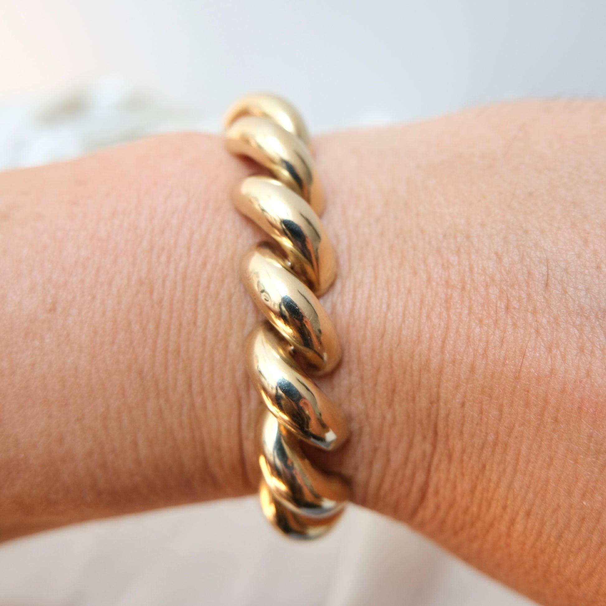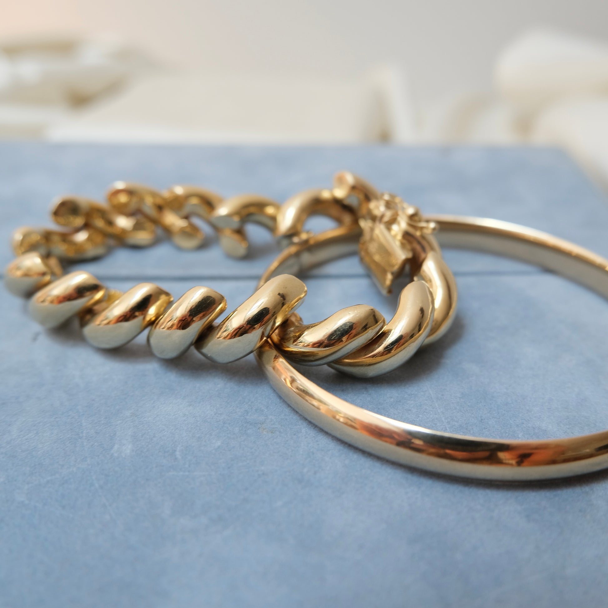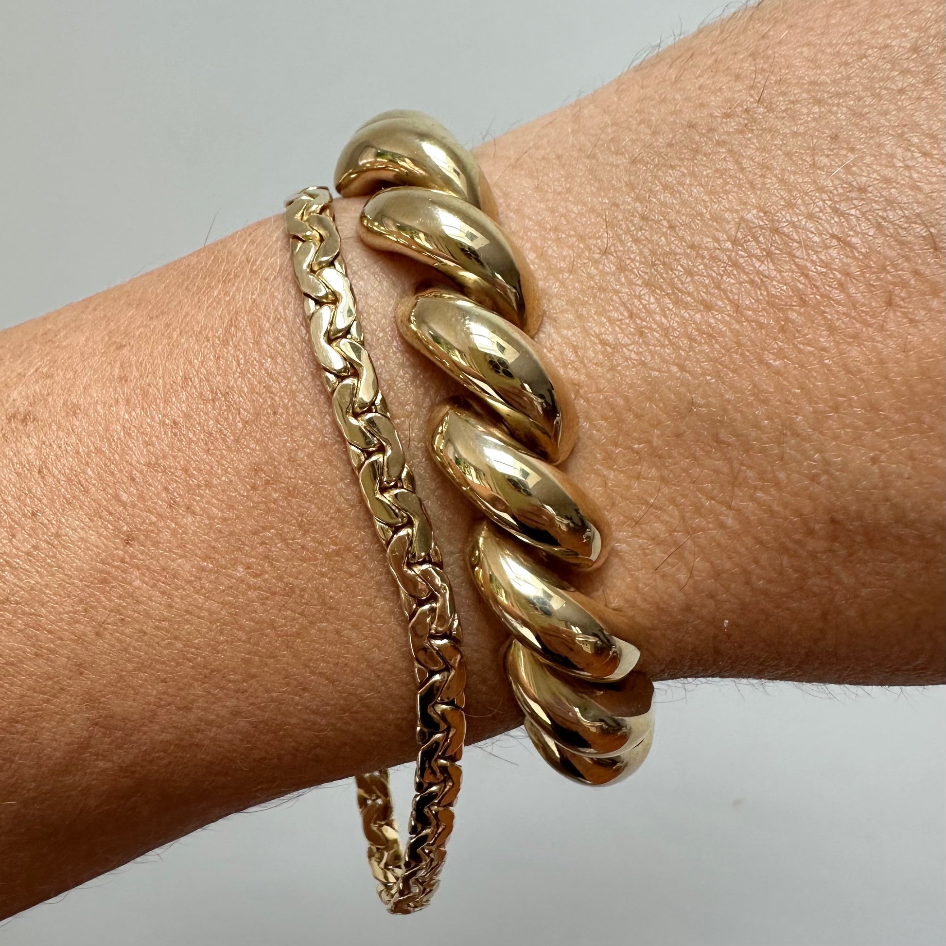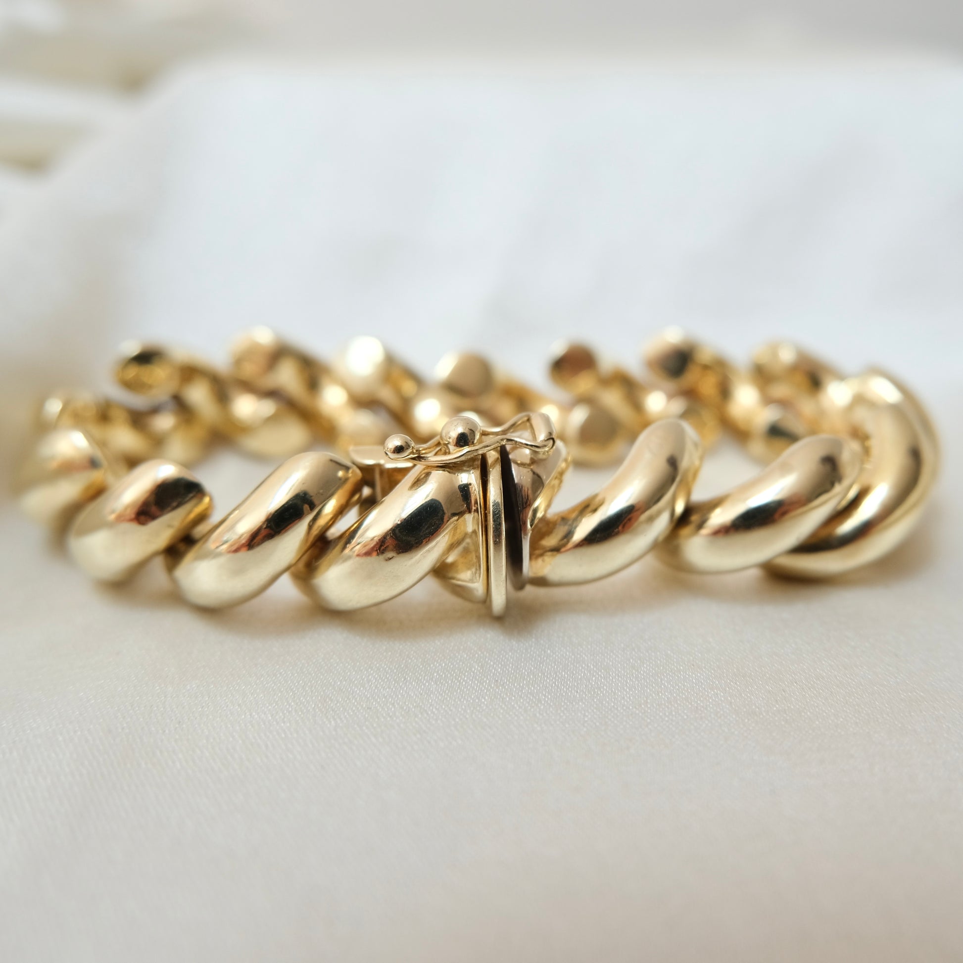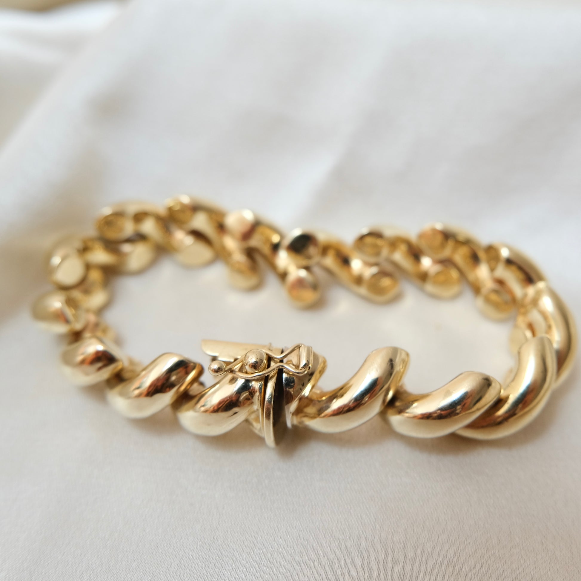 The epitome of Italian glamour. Hailing from the 80s is this generous sized San Marco bracelet in beautiful 14k Italian Gold, acquired from Arezzo, the heart of Italian craftsmanship. A stunning buttery vintage gold with full Italian hallmarks and the most standout statement vintage push clasp with a figure 8 fastener - this bracelet is so luxe even words cannot do it justice. With a beautiful weight to it at 25 grams, wear it on its own or stack it with your everyday pieces - it’s the most magnifique bygone era bracelet at 6.75 inches long.